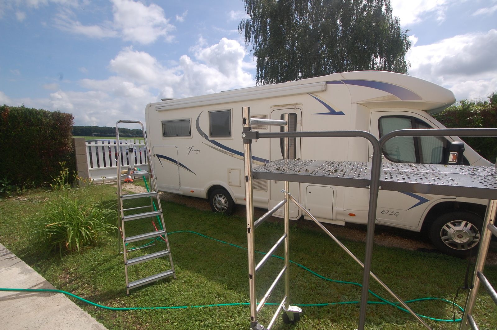 Si la carrosserie a retrouvé de l'allure, les parties hautes du camping-car restent le problème du nettoyage, en particulier l'accès au toit. Si certains n'hésitent pas à monter dessus, nous avons préféré nous abstenir, et nous contenter d'utiliser un échafaudage amovible permettant de l'atteindre plus facilement.